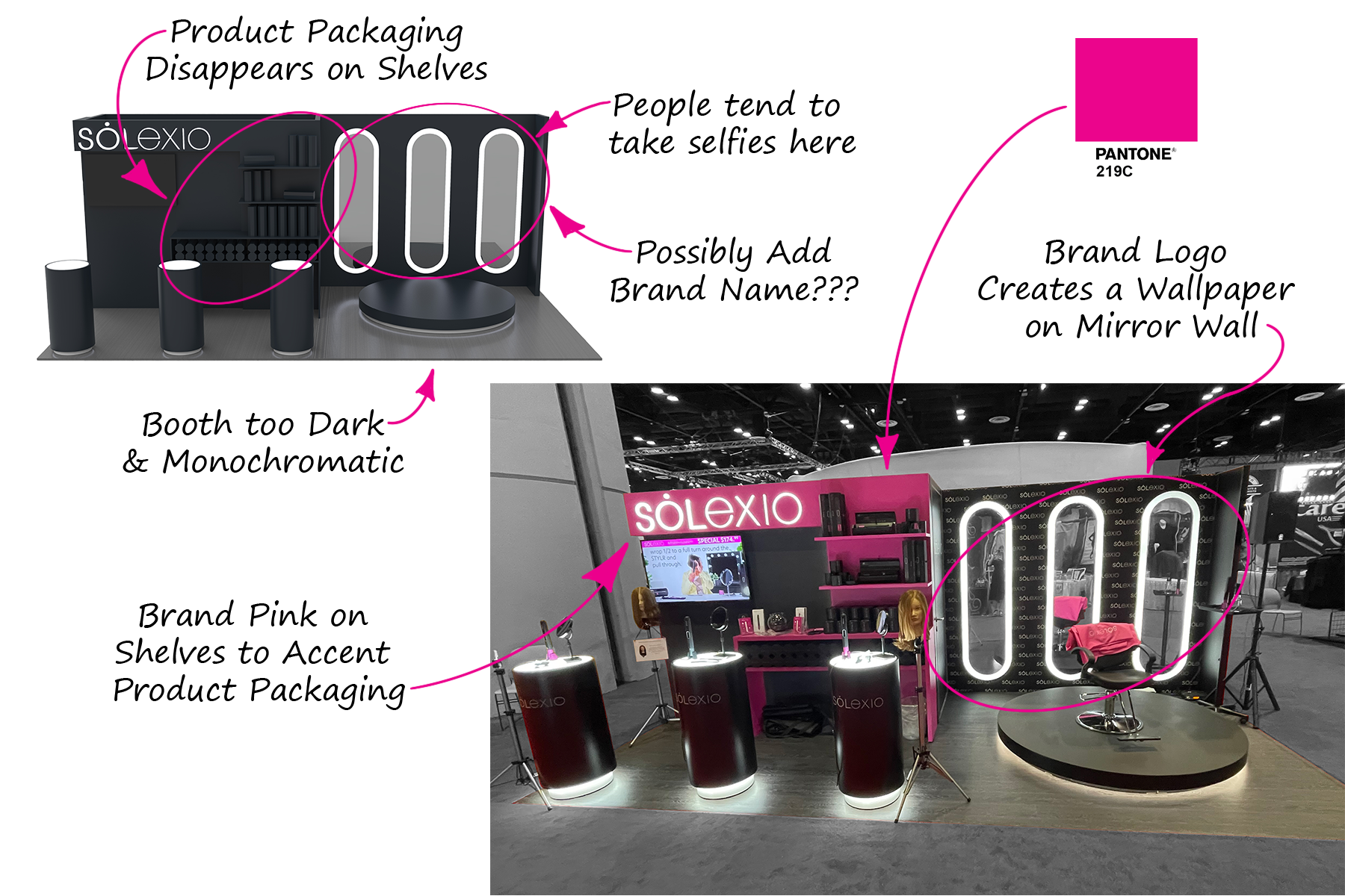 Updated booth graphics, designed by Elevation3D, to enhance product visibility on display shelves and create a selfie station with the brand logo around the illuminated mirrors.
